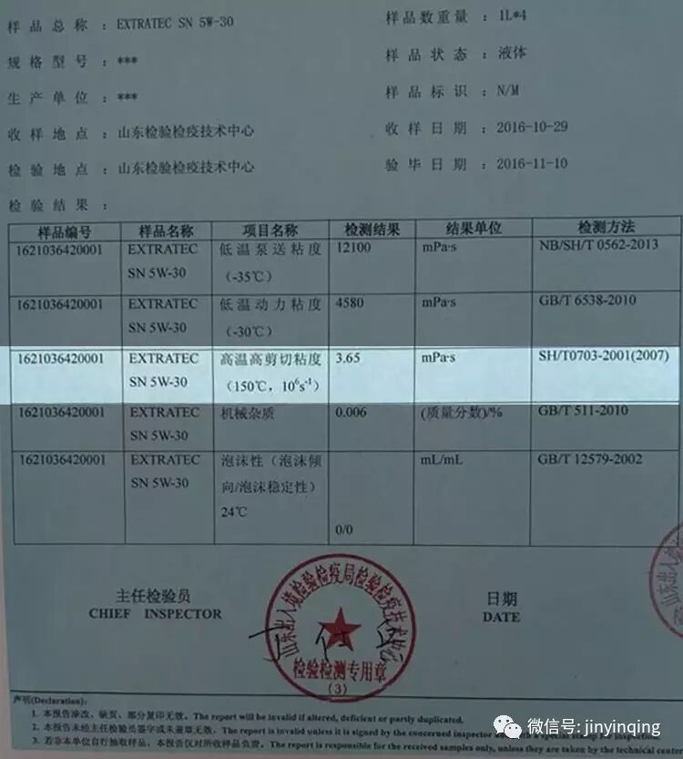 金引擎钛金宝驰5W30 CCS粘度检测报告-高温高剪切。