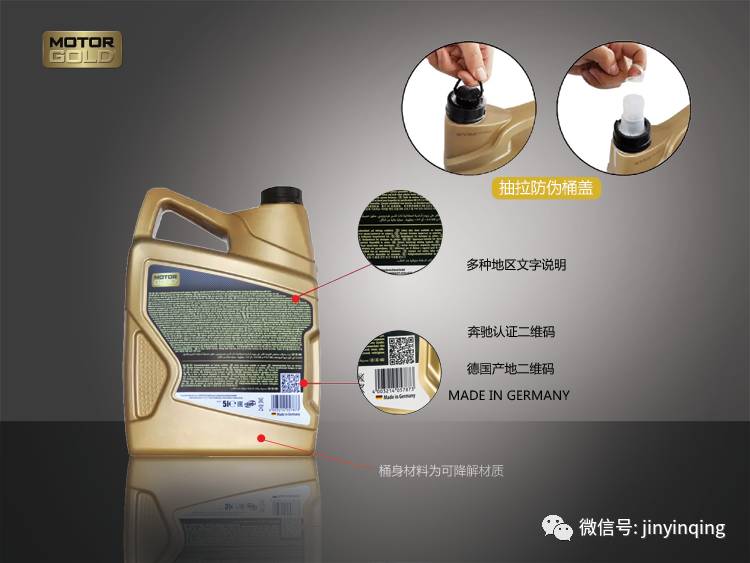 德国原装进口机油金引擎全系列采用更环保,可降解的PE-HD高密度聚乙烯桶,外观表现为桶体更软,韧性更好;桶身同时桶侧明确说明废旧机油处理方法,体现了德国人对环保的严禁态度,桶身,由AVISTA OIL集团申请专利注册。