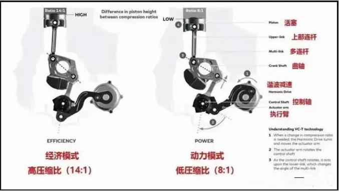 在低负荷工况(如匀速行驶)时,可变压缩比可提升至14:1,提高热效率,降低油耗。例如日产天籁2.0T车型在低转速时采用高压缩比,燃油经济性优于传统涡轮增压发动机。