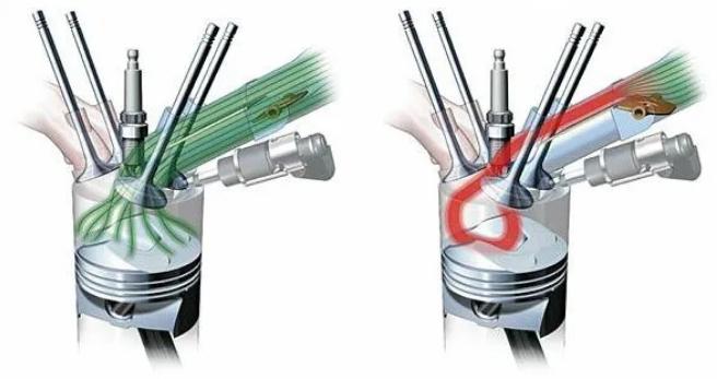 第二种方式,利用燃烧室独特设计的壁面结构,令混合气产生滚流,进而产生浓度差异;通过可变进气技术,在发动机低速运转时,对部分进气道实施截流,以增大进气涡流强度,促使混合气实现分层。