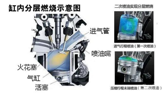 分层燃烧技术的发动机气缸内所形成的混合气浓度并不是均匀的,在靠近火花塞的内层空间混合气偏浓,在靠近气缸壁与活塞顶部混合气则偏稀。这样混合气就形成了由内及外、由浓到稀的状态,这样为分层燃烧做好了准备。