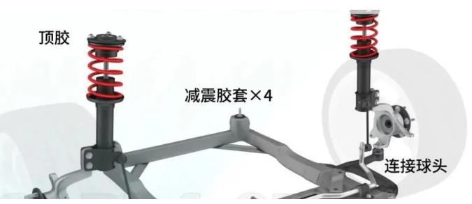 首先就是橡胶件,汽车的很多部位使用了橡胶件,是要目的为了隔绝及吸收震动。悬挂的拉杆、支臂与车架的连接,副车架与车身,甚至整个排气管都是通过橡胶套与车身连接。有的橡胶连接件内部是空腔注油的,为的是更好的吸收低频震动。