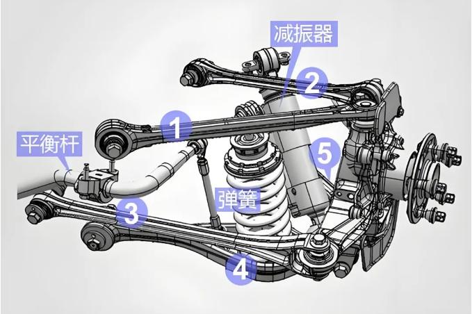 通过五根连杆(通常包括控制臂、后置定位臂、上臂、下臂和前置定位臂)精确约束车轮的运动轨迹,能有效抑制车辆在高速行驶、紧急变道或过弯时的侧倾,提升车身的支撑性和循迹能力,使驾驶者对车辆的控制更加精准。