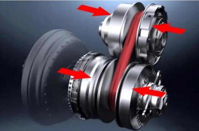而CVT变速箱锥形轮对钢带的夹紧力度是会改变的,传递扭矩小的时候需要的摩擦力小,夹紧力就小。传递扭矩大的时候需要的摩擦力大,夹紧力就大。由于锥形轮表面是倾斜的,所以在夹紧钢带的时候钢带必然会有向外滑脱的趋势,这时候钢带内部的柔性环会固定住钢带,但同时柔性环也会被拉伸,传递的扭矩越大柔性环受到的拉力越大。