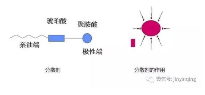 能吸附已经生成的积碳和漆膜等固体小颗粒,使之成为一种胶体溶液状态分散在油中,阻止这些物质进一步凝聚成大颗粒而黏附在机件上,或沉积为油泥。