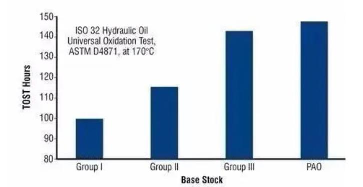进口润滑油加盟|下图是一到四类基础油的氧化测试,试验方法ASTM D4871,测试温度150℃,蓝色柱状图是代表不同基础油在相同高温环境下使用的小时数,越矮说明此类基础油时间越短、变质越快。