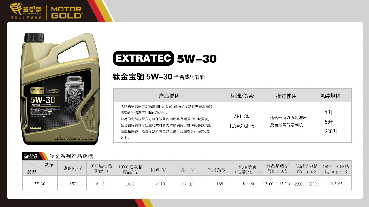 德国原装进口金引擎全合成润滑油研发了“金油膜”技术,此项技术采用了金引擎特有的含纳米金属颗粒的油膜分子,该分子会在引擎内部形成一层金油膜,确保了低粘度油品的高温高剪切粘度达3.5以上,有效保护发动机、降低磨损,经权威机构检测,金引擎钛金宝驰5W30全合成润滑油的HTHS>3.65 。ACEA(欧洲汽车制造商协会)A3/B4标准要求的HTHS不能低于3.5,涡轮增压发动机要求HTHS>3.2,API(美国石油学会)HTHS的标准是2.6,所以金引擎的产品是完全基于ACEA的最高标准来生产,通过优质的全合成基础油(PAO)和顶级添加剂以及“金油膜”技术的科学调和,优异的低温流动性,在车辆冷启动时可瞬时到达润滑点,减少磨损,同时发动机在高温工况下确保稀薄的油膜具有超强的油膜强度,带来的就是发动机动力的提升,提高了燃油效率,结合降噪低摩技术,发动机静音效果得到了优化。