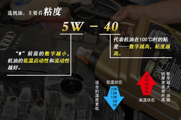 对于机油的粘稠度,我们使用的是SAE等级标识,例如:SAE15W-40“W”表示 winter(冬季),其前面的数字越小说明机油的低温流动性越好,代表可供使用的环境温度越低,在冷启动时对发动机的保护能力越好;“W”后面(一横后面)的数字则是机油耐高温性的指标,数值越大说明机油在高温下的保护性能越好。