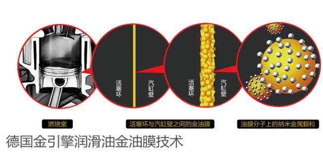 德国金引擎通过几十年研制生产高品质润滑油的宝贵经验开发了“金油膜”技术,该技术采用了含纳米金属颗粒的油膜分子, “金油膜”分子的超强附着力和对缸内轻微划痕与磨损的修复能力,能有效增加德系发动机网状储油格汽缸的密封性,防止活塞运转时把机油带到燃烧室。