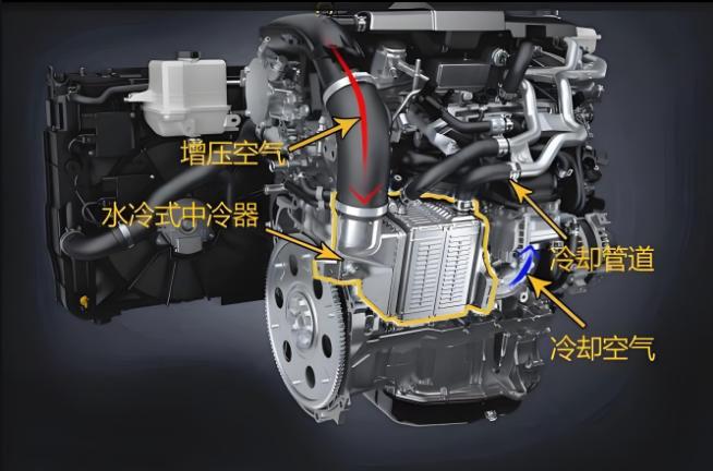 水冷依托发动机冷却系统的冷却液来完成冷却空气。将一个冷却器放进进气管道里,让增压后的热空气流过。而冷却器里则有冷却水不断地流动,从而带走增压空气热量。水冷的优点是管道布置更灵活,可以布置在靠近发动机进气歧管的位置,因此大大改善“涡轮迟滞”,并且由于不暴露在外界环境中,不容易出现脏污问题。