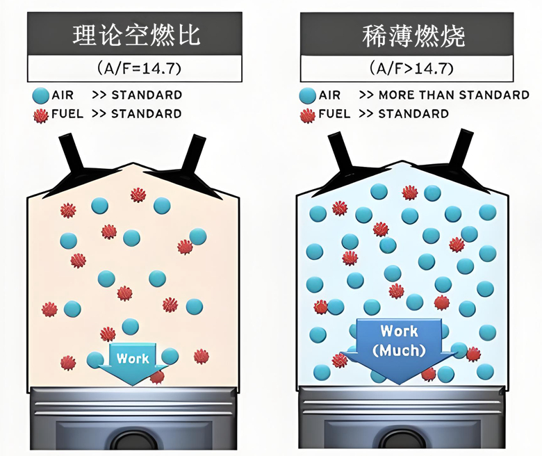 国六排放级别提高,相比国五无论是一氧化碳、碳氢化合物,还是氮氧化物成分都降低了许多。而达到这种程度,首先国六发动机会选择“稀薄燃烧”。通过空气多,燃料少,这种“高空燃比”来强制降低尾气中的“气体碳合物”。
