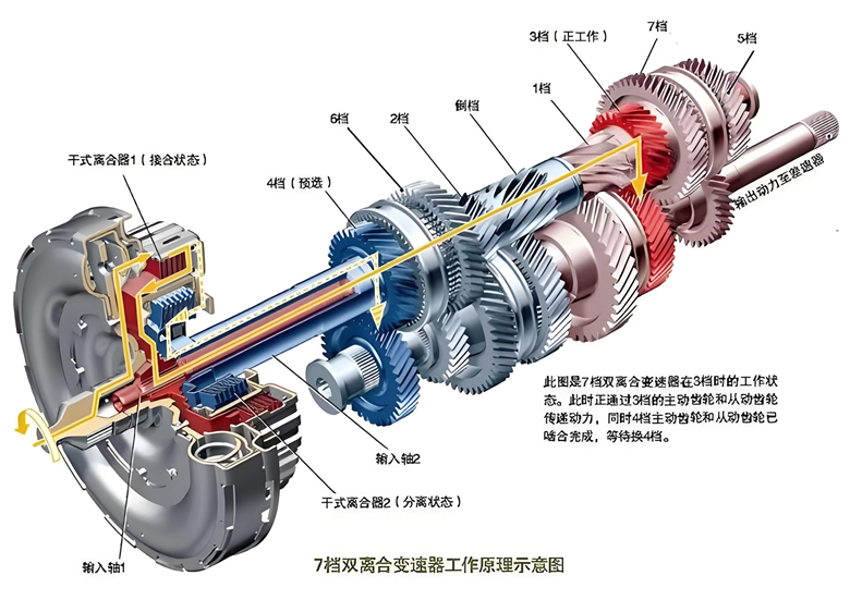 网上都形容双离合是两套手动变速箱合成的。它的运行机理与手动挡相类似,而且耦合装置更趋近于手动变速器,采用多片式离合器。但是与手动挡不同的是,双离合主要依赖其智能控制系统和双离合器的协同工作,确保发动机与变速箱的分离状态,避免动力中断。