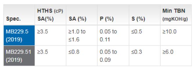 奔驰MB229.51标准:不仅满足ACEA的A3/B4,还满足C3标准,在MB229.5的高剪切保护基础上降低了灰分、硫、磷含量,适合国六车型,高温抗剪切(HTHS)的要求同样是大于3.5。