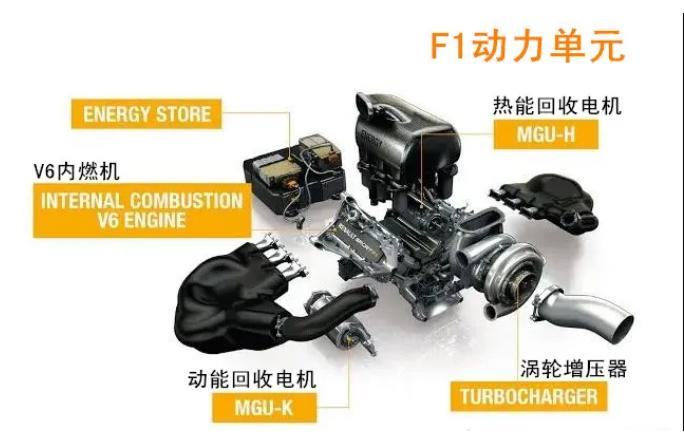 F1赛车所使用的1.6T是混合动力单元,整个单元包括内燃机、MGU-H热能回收系统、MGU-K动能回收系统、电动机所组成。1.6升涡轮增压v6发动机可以输出700到800马力,加上电动机的马力,整个动力单元可以输出1000马力以上。