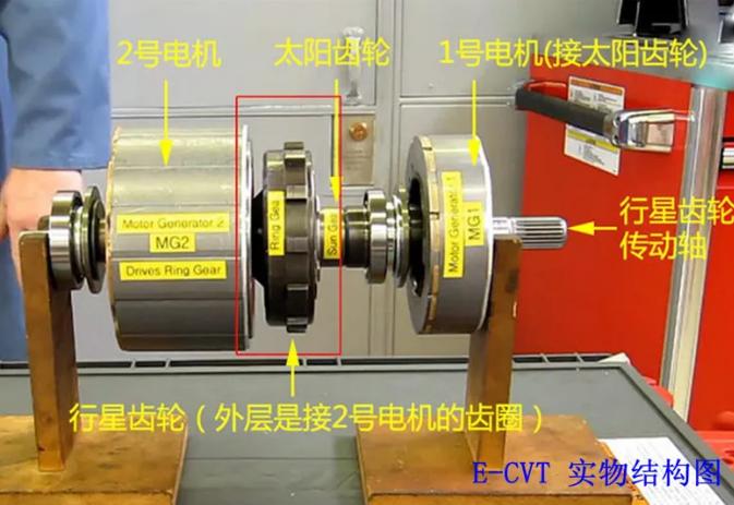 以混动卡罗拉的E-CVT结构为例,一号电机会连接行星轮,2号电机会连接齿圈和差速齿轮,以此来形成动力的输出。行星齿轮在AT变速箱控制齿比,那在E-CVT变速箱里就是控制不同的驱动形式,所以E-CVT是一个动力分配机构。