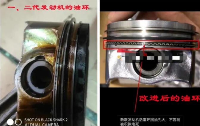 第二个重点“活塞环”,活塞上有三道活塞环,最下面一道是油环。它的作用是把气缸壁上多余的机油刮下来,避免进入燃烧室。它的结构是多孔式的,同时在活塞的相应位置有回油孔。如果油环上的孔或者活塞上的回油孔被堵塞,油环的刮油作用就会大大降低,从而导致更多的机油被泵入燃烧室。