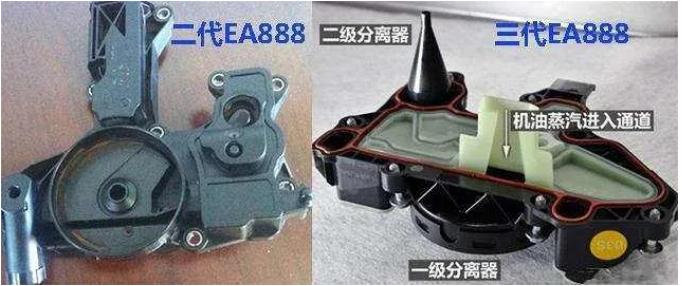 一二代EA888发动机,曲轴箱通风阀设计得较为简单,曲轴箱中的废气在通风阀中停留时间较短,流经的路径不够曲折,废气冷却不足,这样就导致废气中的机油分离不彻底,更多的机油蒸汽被吸入燃烧室参与了燃烧。