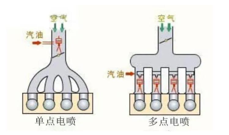 多点电喷也就是我们平时说的“歧管喷射”,是在单点电喷的基础上改进得来的。早期的电喷技术从单点电喷开始,单点电喷的喷油嘴放在发动机进气歧管的节气门位置,燃料喷入后先和空气进行混合,再将混合气体通过进气歧管分配到各个气缸中。但这种喷油方式由于四个进气歧管的长度不同,会导致不同气缸会燃烧不充分,进而发动机运行也会不稳定,单点也被淘汰。