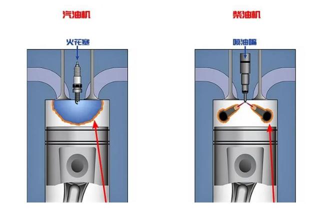 压燃 vs 点燃:柴油机采用压燃式(压缩空气至高温后喷油自燃),而汽油机需火花塞点火,后者存在点火能量损耗 。
