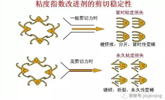 第一,粘度指数改进剂作为一种高分子聚合物,在受到剪切力作用时分子链会发生断裂,导致其稠化能力下降。如果添加了剪切安定性差的粘度指数改进剂的机油在使用过程中,因受到油泵、活塞等机械部件的剪切作用,粘度会明显下降,造成异常磨损。