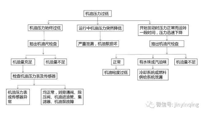 发动机启动后机油压力迅速降至0左右,或发动机在正常温度和转速下运转时,机油压力始终过低。机油压力警告灯会不断闪亮或蜂鸣器报警。