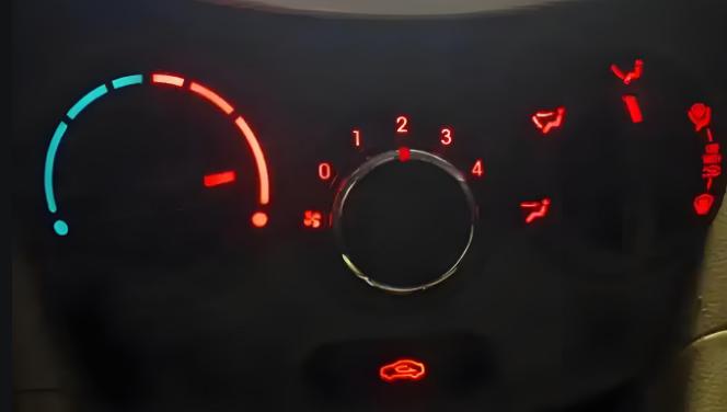 3,将空调旋钮从蓝色区域调至红色区域,有的车用小太阳标识表示;