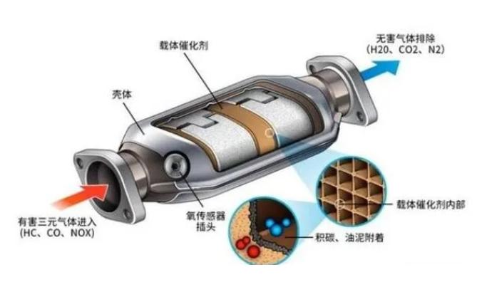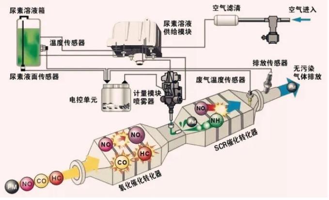 尿素在高温下分解为氨气,氨气与尾气中的氮氧化物(NOx)在催化剂作用下发生氧化还原反应,最终生成无害的氮气(N2)和水蒸气(H2O)排出 。